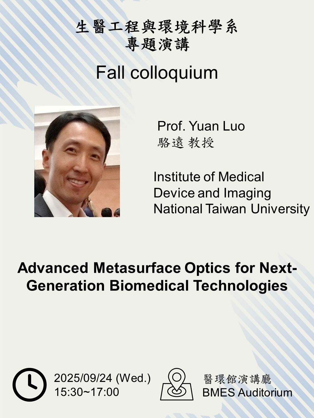 2025/09/24 (三) 歡迎台灣大學醫療器材與醫學影像研究所駱遠教授蒞臨演講,主題:Advanced Metasurface Optics for Next-Generation Biomedical Technologies