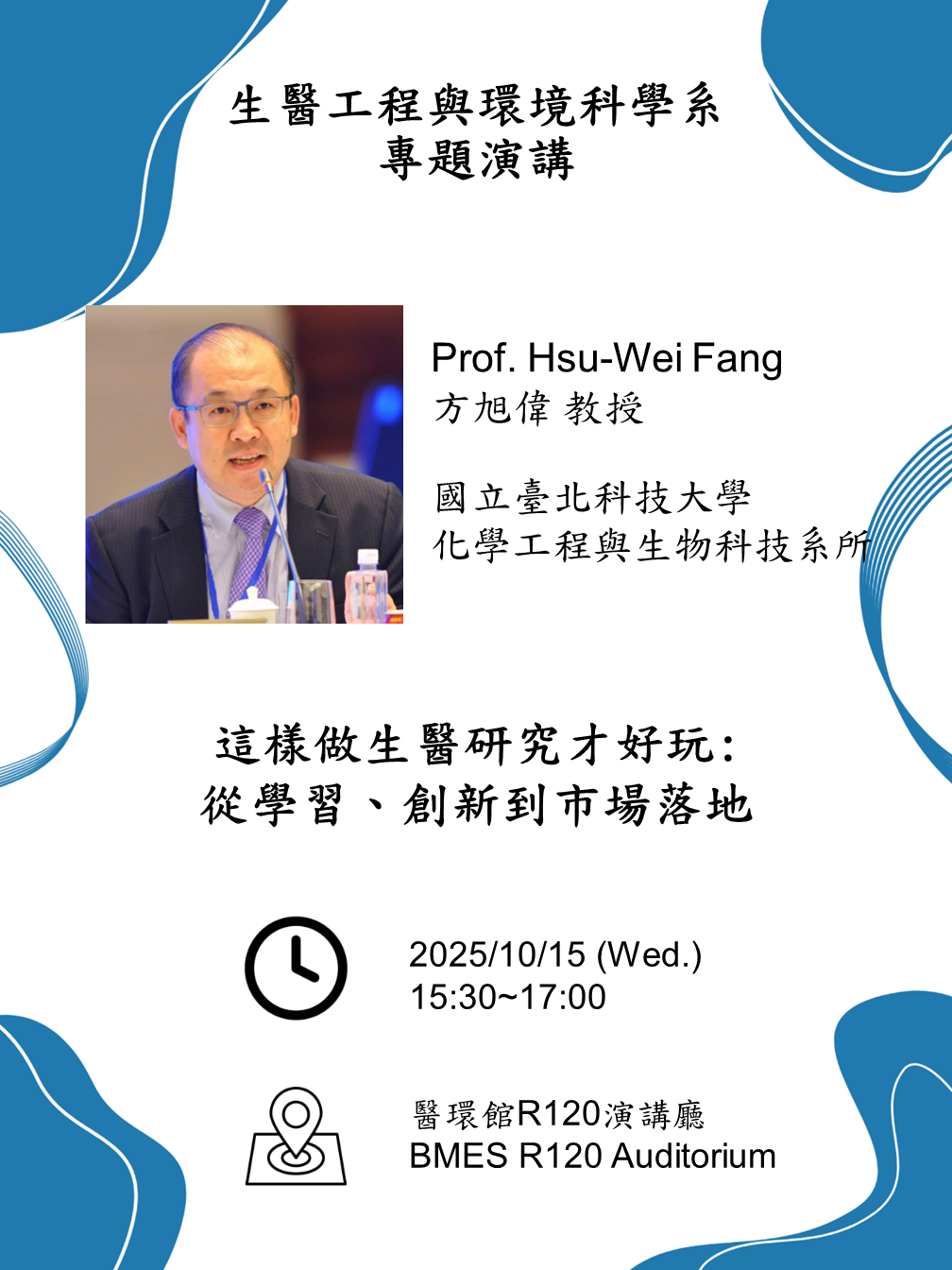 2025/10/15 (三) 歡迎國立臺北科技大學方旭偉特聘教授蒞臨演講,主題:這樣做生醫研究才好玩: 從學習、創新到市場落地