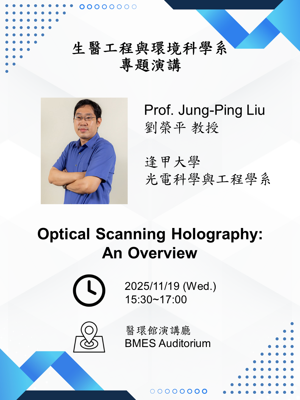 2025/11/19 (三) 歡迎逢甲大學光電科學與工程學系劉榮平特聘教授蒞臨演講,主題:Optical Scanning Holography: An Overview