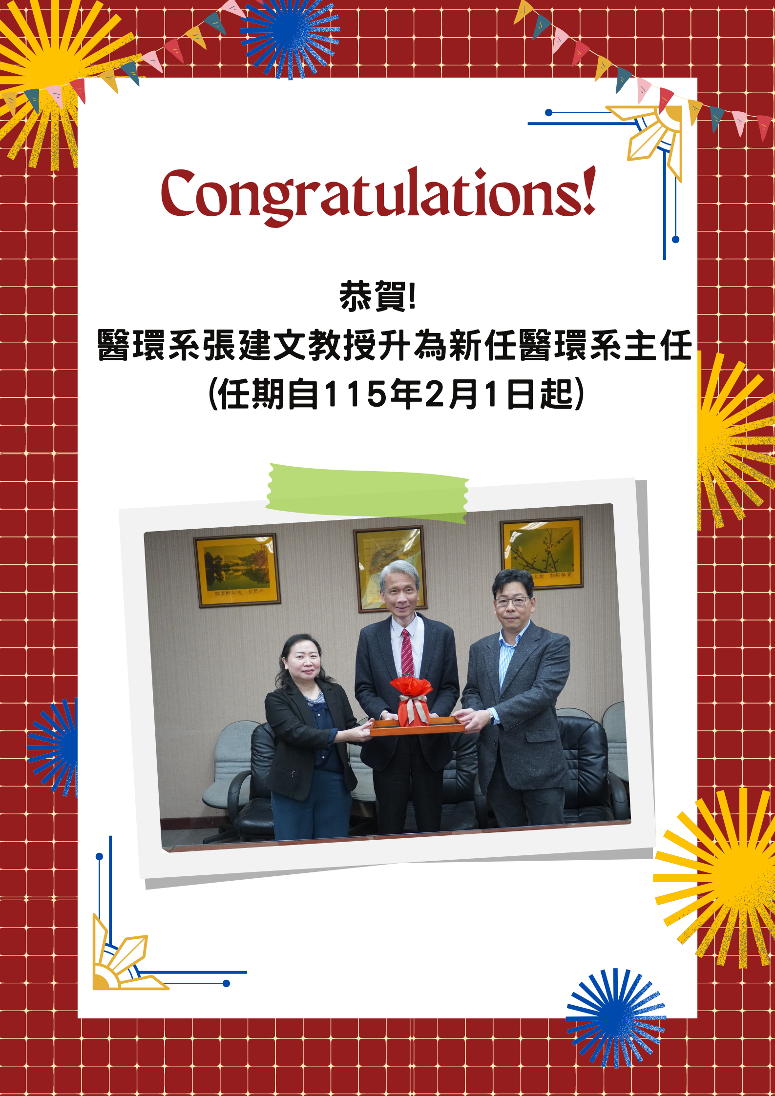 賀!本系張建文教授升為新任醫環系主任(任期自115年2月1日起)