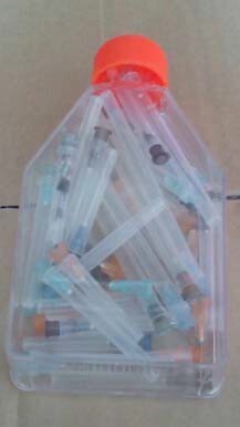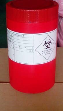 (2)、實驗針頭類之固體廢棄物應使用堅固容器盛裝(參考如下圖),清運時應確實封蓋,嚴禁摻入固廢袋中。常溫存放。(盛裝容器請自備)