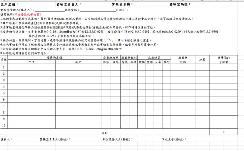 4-3、作業方式:請先下載廢棄化學藥品(含不明)調查表,填表完畢後,先以 Excel 電子檔寄給環安中心,待確認無誤後,將進行排程清運。