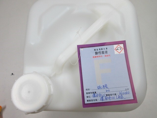 (1)、限制以 20 公升之 PP 材質四方形桶(白色)(可參考如下圖),桶子應由實驗室自行準備,承裝不得超過最高液面刻度或八分滿,瓶蓋需可確實蓋緊,保持整潔,廢液不外漏。