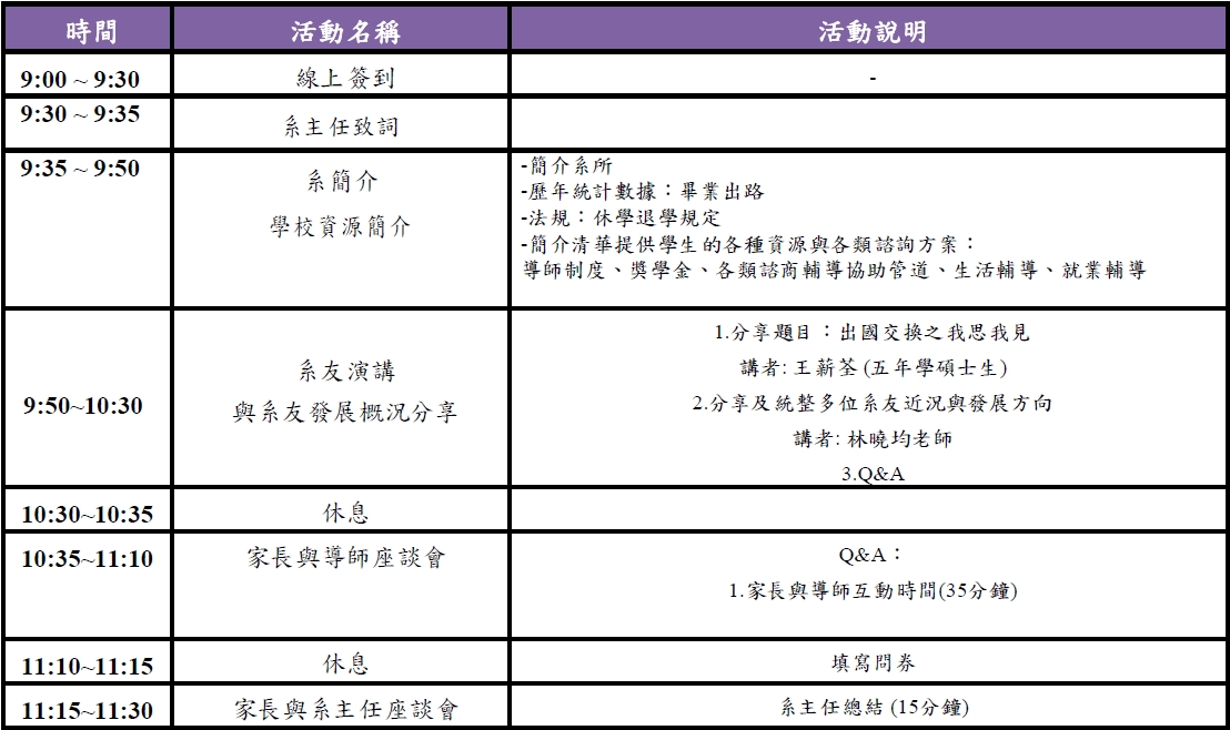 本次家長座談會採"線上方式"進行,為讓您更了解整個活動內容,以及座談會中提及的學校與本系資源,敬請下載瀏覽附件一_"115年家長座談會暨系友分享會手冊"。
